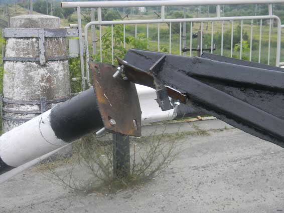 Працівники автомобільної інспекції, які оглядали місце події, стверджують, що вони не виявили ні залишки фарби, ні битого скла, ні гальмівний шлях можливого порушника, який би зачепив та зніс цей обмежувач висоти.