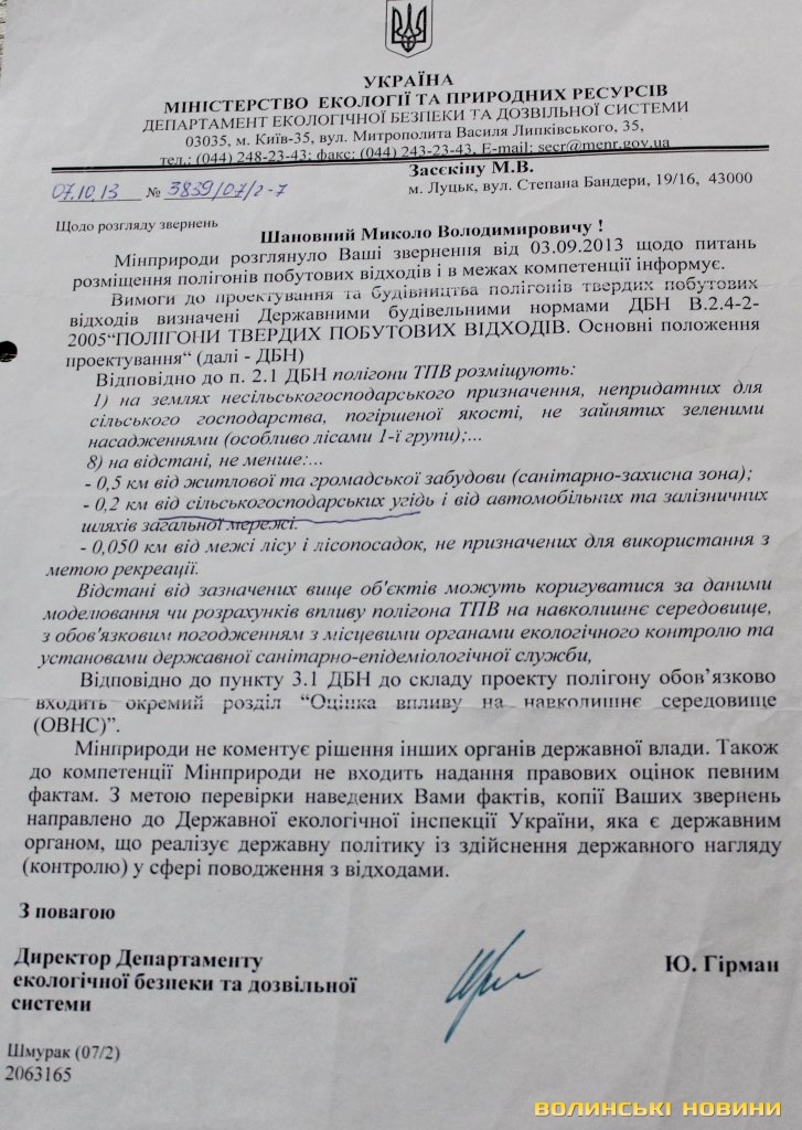 Своєю чергою, у державній екологічній інспекції у Волинській області відповіли, що спеціалісти інспекції протягом 2013 року неодноразово розглядали звернення Миколи Засєкіна з виїздом на місце, провівши останню перевірку 4 листопада 2013 року.