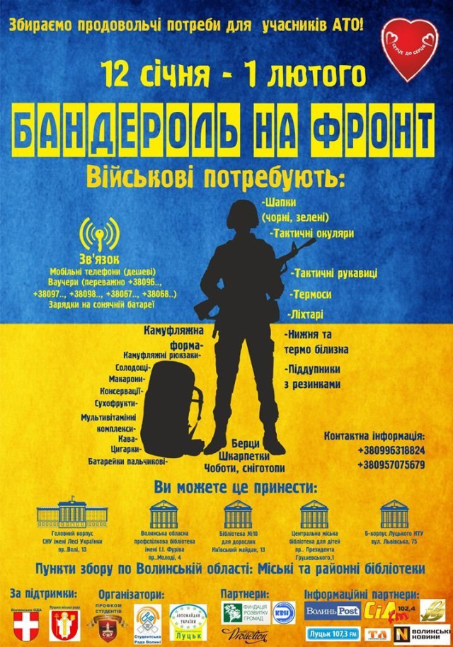Всеукраїнський благодійний фонд «Серце до серця» організовує І обласну благодійну акцію під назвою «Бандероль на фронт». Акція триватиме з 12 січня до 1 лютого в усіх районах та містах Волині. Про це інформує регіональний представник Фонду у Волинській області Богдан Іщук.