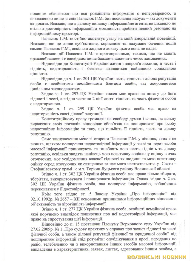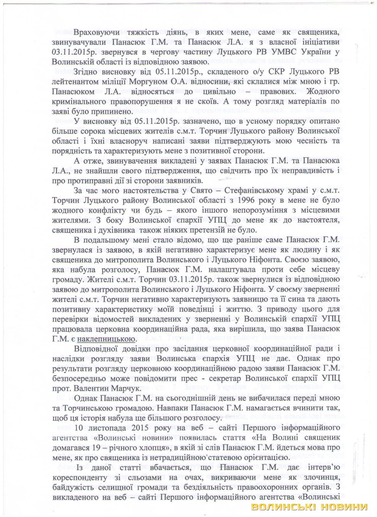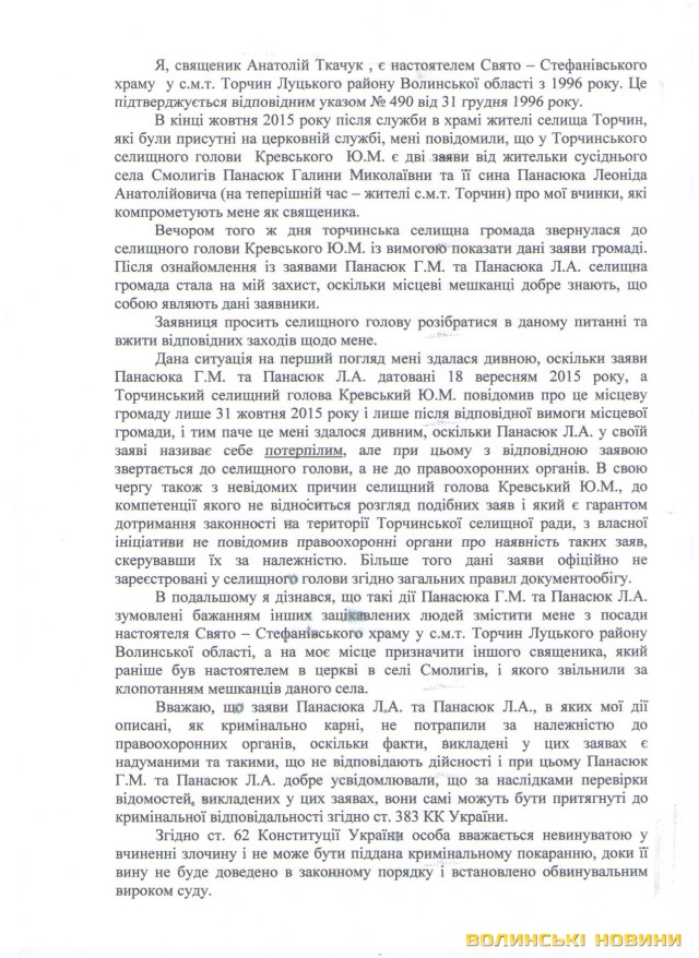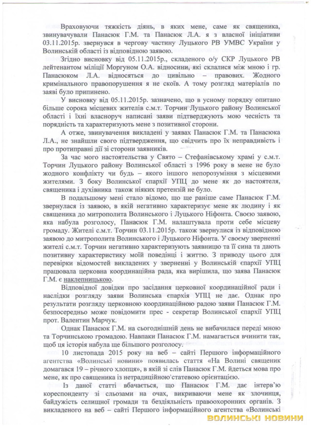 «Я дізнався, що такі дії Панасюка Г.М. та Панасюк Л.А. зумовлені бажанням інших зацікавлених людей змістити мене з посади настоятеля Свято-Стефанівського храму у селищі Торчин Луцького району. А на моє місце хочуть призначити іншого священика, який раніше був настоятелем церкви в селі Смолигів, і якого звільнили за клопотанням мешканців цього села.