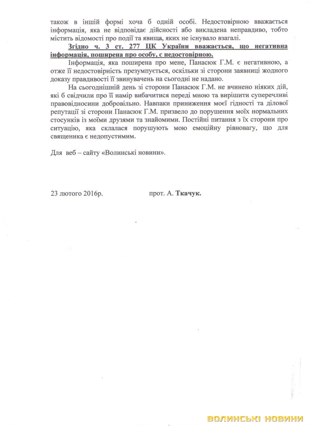 Зміст листа отця Анатолія Ткачука, який отримала редакція Інформаційного агентства Волинські Новини, подано нижче без змін: