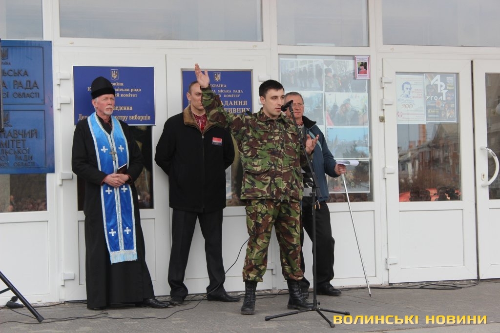 «У зв’язку з тим, що ми бачимо недієздатність цієї влади, вчора перейменована партія Українська національна асамблея у партію Правий сектор, тобто ми діємо, як політичне крило. Від сьогодні ми будемо йти двома напрямками – політичним, тому що ми готові брати на себе відповідальність та керівництво державою, та громадським і силовим (ми готуємо загони хлопців та хочемо надалі зберігати та контролювати громадський порядок спільно з правоохоронними органами)», - розповів ковельчанам лідер Правого сектора Волині Павло Данильчук.