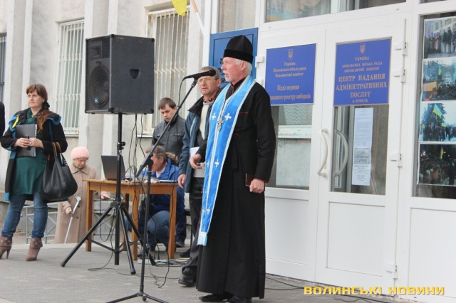 Захід розпочали із молитви. Священик УПЦ Київського патріархату отець Анатолій закликав молитися за те, «щоб чужоземний чобіт не топтав українську землю». Він засудив тих, хто називає себе православними, проте під час посту нападає на братній народ, а патріарх Кирил благословляє це. Водночас, він звернув увагу на те, що наразі не зменшилося віруючих у чужоземній церкві, церкві Московського патріархату. Він обурився, що дехто зі священиків говорить, що був на Майдані, проте їх там не бачив.