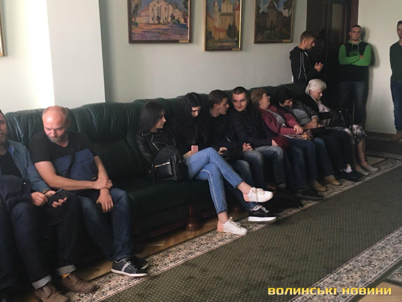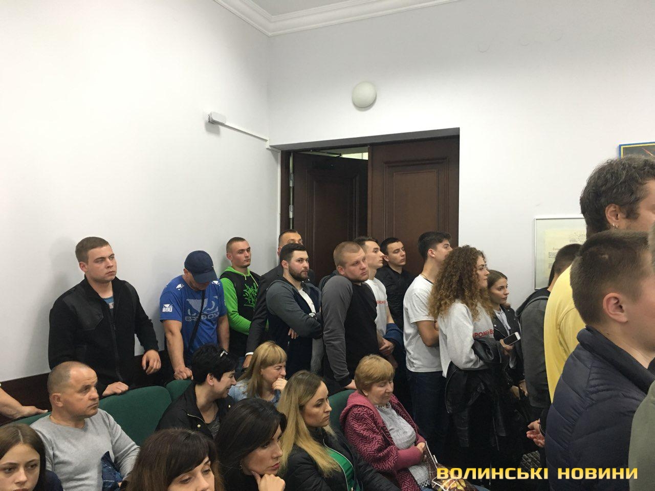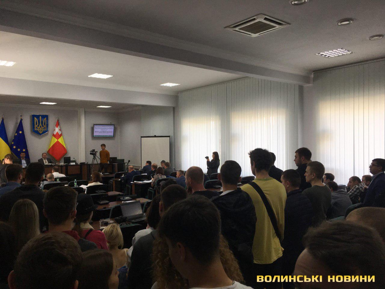 У приміщенні під дверима зали, де відбувається засідання, зібралися десятки молодиків. Ймовірно, це працівники та охорона РЦ «Промінь», адже на виконкомі розглядатимуть питання про розірвання договору оренди щодо парковки розважального центру.