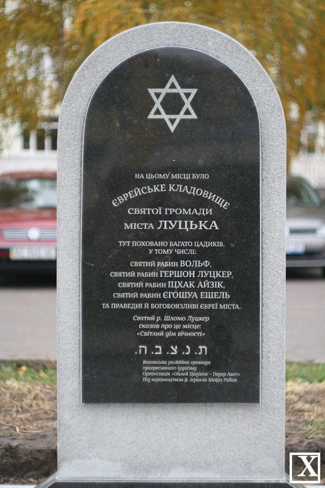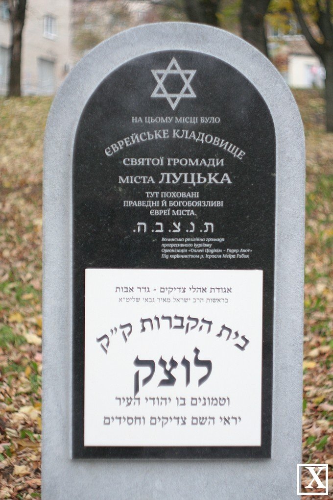 «На цьому місці було єврейське кладовище святої громади міста Луцька. Тут поховано багато цадиків, в тому числі: святий рабин Вольф, святий рабин Гершон Луцкер, святий рабин Іцхак Айзік, святий рабин Єгошуа Ешель та праведні й богобоязливі євреї міста. Святий р. Шломо Луцкер сказав про це місце: «Світлий дім вічності»», - ідеться у тексті меморіального знаку.Другий знак встановили на узвозі «Тещин язик». Єврейське кладовище в тому місці було із середини ХІХ століття.