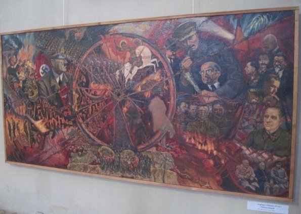 Друга картина - «Колесо історії» - представляє другу світову війну. Посередині між двома арміями зображене колесо історії, над якими летить Георгій Побідоносець. «Георгій Побідоносець зображений у іконописному стилі, убиває злого змія-демона, – розповідає Валентина Коробань. – Чорним орлом зображена армія фашистів, які з торжеством приходять і проходячи крізь колесо виходять переможеними. З іншого боку зображений Сталін, в якого під серцем Берія, поруч полководці, яких Сталін стратив».