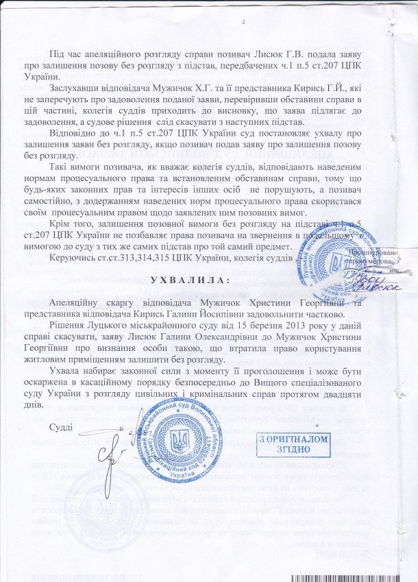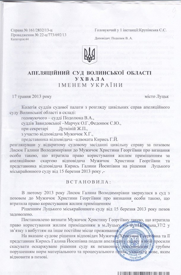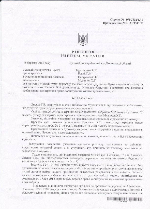 Днями Луцький міськрайонний суд таки виніс рішення на користь Христини і велів власникам житла (Галині Лисюк) віддати ключі від вхідних дверей та усунути перешкоди в користуванні житлом. Тож молода жінка змушена без дитини ночувати у спірному будинку, аби не давати шансів родичам позбавити її домівки, яку для доньки придбала за життя покійна мати Олена.