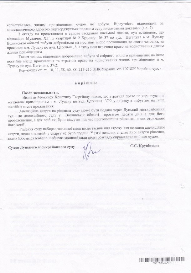 Однак на цьому, історія з переписом успадкованої хати не завершилася. Тітка Христини – Галина Лисюк, отримавши документи права власності на будинок вирішила звернутися із позовною заявою до суду аби сироту виселили із її житла. Більше того, жінка попросила представників Феміди визнати її племінницю такою, що втратила право на це помешкання, позаяк вона переїхала жити у садибу свого чоловіка – Вадима Мужичка. Натомість, як каже Христина, вона ніколи не виїжджала із рідної домівки. Тим паче, що жила молода жінка поруч і щодня провідувала свою бабусю.