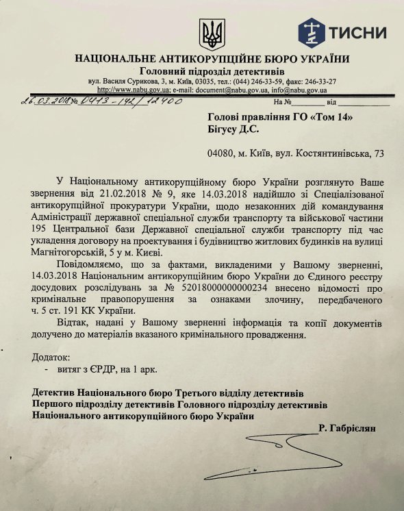 У зв'язку з цим НАБУ розслідує незаконні дії командування Держспецслужби транспорту, яке виділило землю під будівництво житла для військових. Справу відкрили за статею "розтрата".