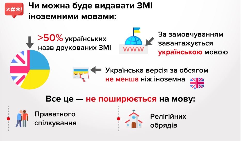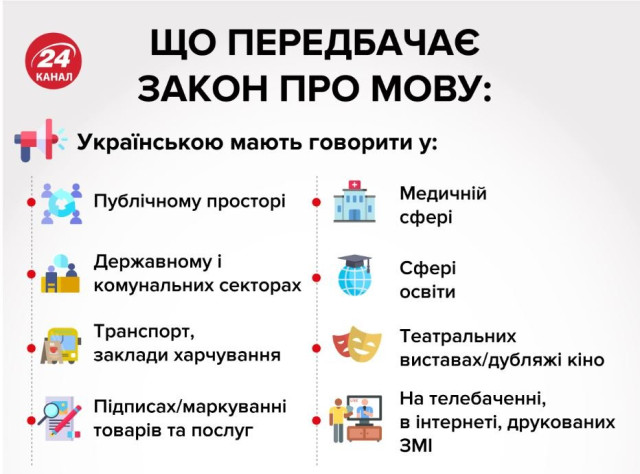 Що саме загалом передбачає закон про українську мову, дивіться в інфографіці:Закон про забезпечення функціонування української мови як державної Верховна Рада України ухвалила 25 квітня 2019 року. 15 травня документ підписав п’ятий президент України Петро Порошенко.