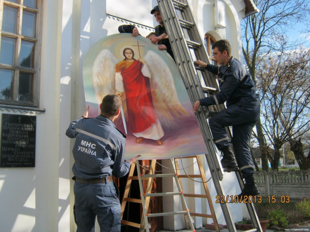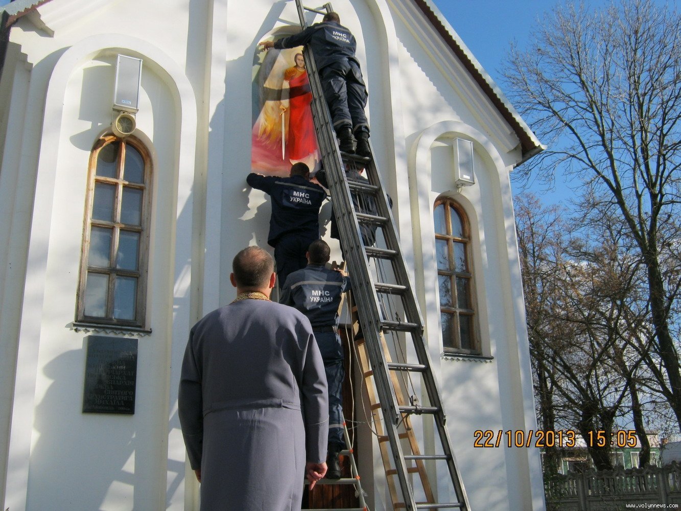 Святиня засяяла над входом у храм. Вона чималих розмірів: висота 1,80 сантиметра, ширина – 1,20 сантиметра, а лик митці писали протягом двох місяців. Посприяли в закріпленні ікони працівники місцевого управління надзвичайників.