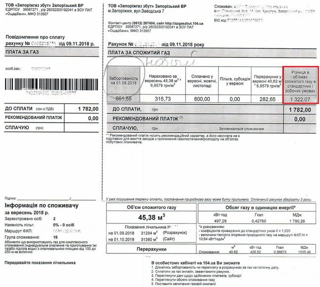 У цій квитанції облгаз-збут зробив перерахунок за останні три роки – з січня 2016 року. Це пов’язано з тим, що даний конкретний споживач хоче змінити постачальника. У стандартних випадках облгаз-збути інформують споживачів про недооплачений обсяг газу. А платити з урахуванням нестандартних умов пропонують з жовтня 2018 року.