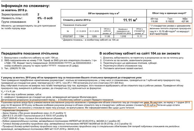 У цій квитанції коефіцієнт перерахунку вказано на рівні 1,01. А також зазначено недооплачений обсяг газу за три попередні роки – 4,55 кубічних метрів при споживанні 12 кубометрів на місяць.