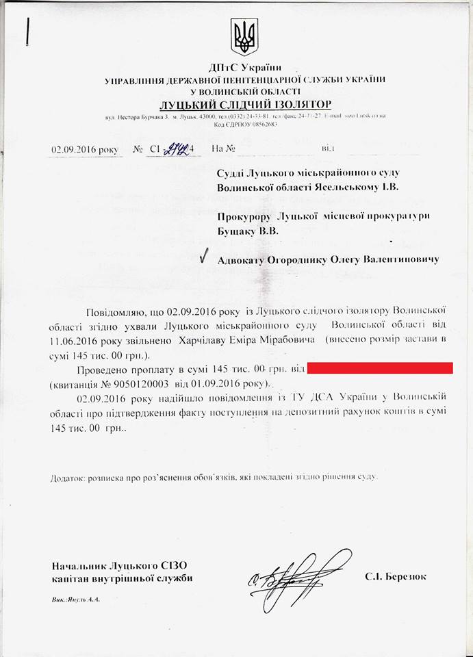 «02 вересня 2016 року із СІЗО звільнили мого підзахисного - Харчілаву Еміра, який обвинувачується у вчиненні злочину стосовно Лапіна І.О. за частиною 2 статті 186 КК України. На даний момент Емір поїхав у Одесу, де зустрінеться зі своїми близькими та рідними і 15 вересня добровільно прибуде у судове засідання по даній справі», - йдеться у повідомленні адвоката.Нагадаємо, 9 червня в Луцьку народний депутат Ігор Лапін відкрив стрілянину по грабіжниках, які намагались вкрасти у нього сумку. Згодом застосування зброї він пояснив тим, що буцімто оборонявся. Натомість зловмисники стверджували, що взагалі не мали при собі зброї, а сам Лапін на прес-конференції зізнався, що випустив у крадіїв усю обійму набоїв і про це не шкодує. В прокуратурі запевняють: досі проводять перевірку щодо цього інциденту. Натомість, згодом з’явилась інформація про те, що за стрілянину посеред вулиці Лапін може відбутися лише штрафом.