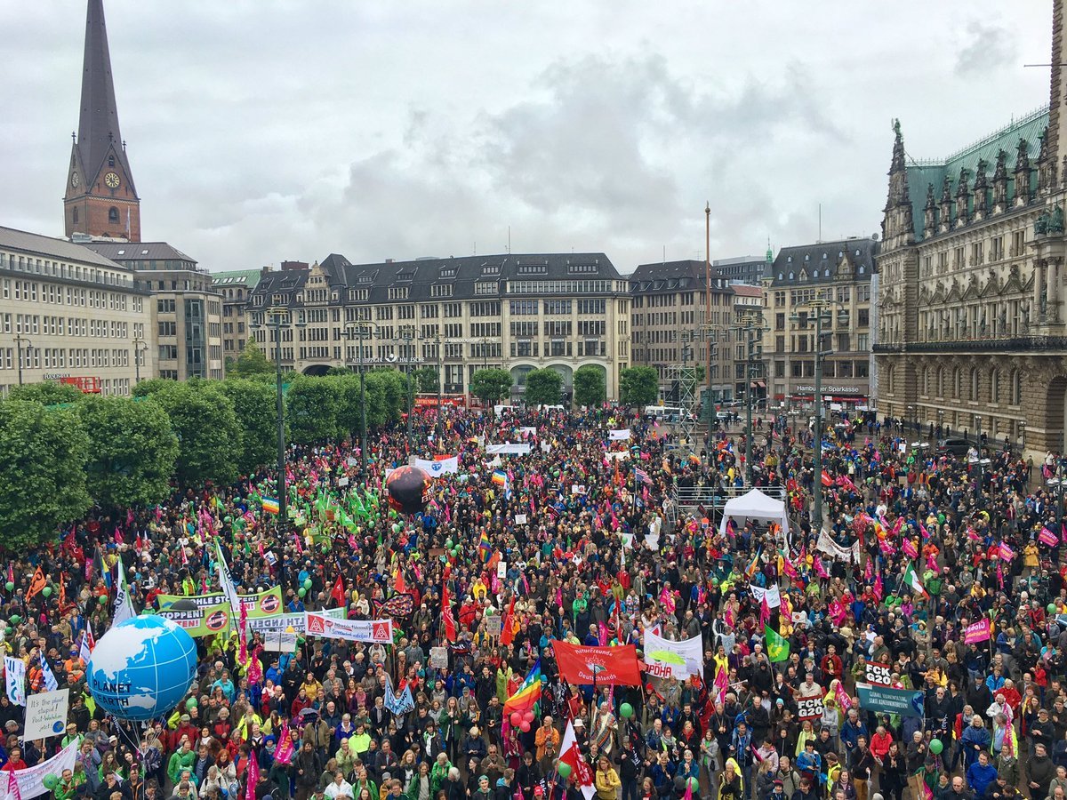 У дощову погоду в Гамбурзі, за даними поліції, зібралося близько 8000 демонстрантів, хоча організатори мітингу заявляють про 18 000 осіб.