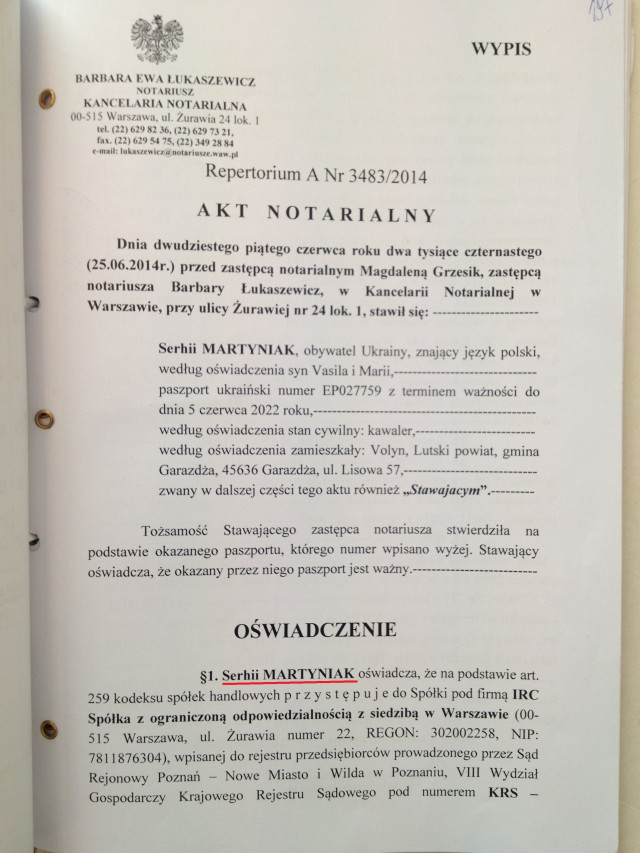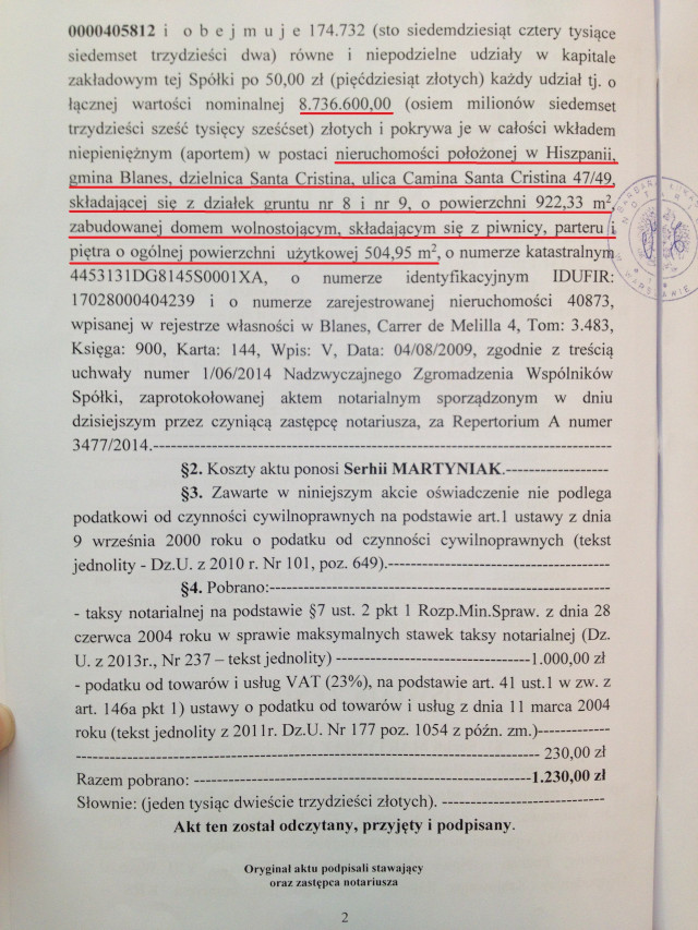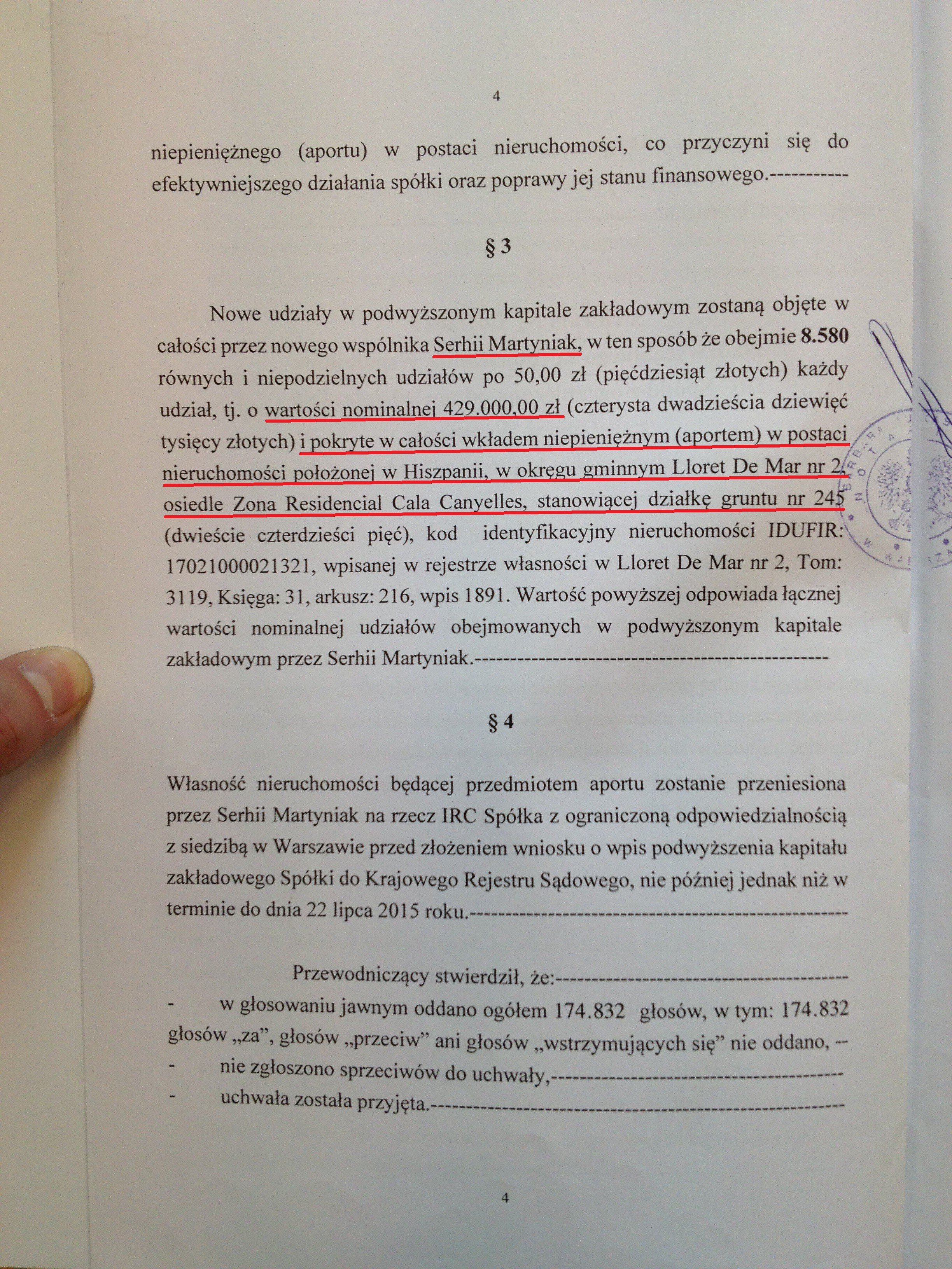Так, згідно з даними реєстру, наприкінці 2014 року нардеп збільшує статутний капітал незадекларованої компанії на 8, 736 млн злотих, а це понад 2 мільйони доларів США. В обмін на частку в компанії Сергій Мартиняк вніс у статутний капітал компанії «IRC» нерухомість, що розташована в Іспанії, вартістю 8,736 тисяч злотих, як апорт в обмін за частки в товаристві. У цьому випадку апорт – це негрошовий внесок у статутний капітал компанії у вигляді нерухомості.