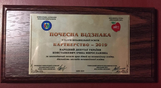 Почесні відзнаки у галузі позашкільної освіти за законодавчий захист прав дітей на позашкільну освіту, діяльність закладів позашкільної освіти отримали народні депутати, члени депутатської групи «За майбутнє» Ірина Констанкевич та Тарас Батенко. Зокрема, парламентарі подали правки до законопроєкту №2299, якими запропонували виокремити позашкілля, як окремий рівень освіти.«Ми хочемо привернути увагу громадськості до позашкільної освіти і показати ті можливості, які вона надає кожній дитині, громаді, державі та суспільству. Позашкільна освіта виконує три важливі функції – освітню, соціокультурну та економічну. Особливістю позашкілля 2019 року стала його активізація на всеукраїнському та міжнародному рівнях», – зазначила президент Міжнародної асоціації позашкільної освіти, завідувач кафедри позашкільної освіти Національного педагогічного університету імені М. П. Драгоманова, заслужений діяч науки і техніки України, доктор педагогічних наук, професор Олена Биковська.