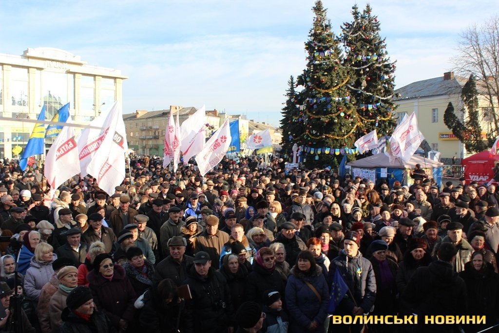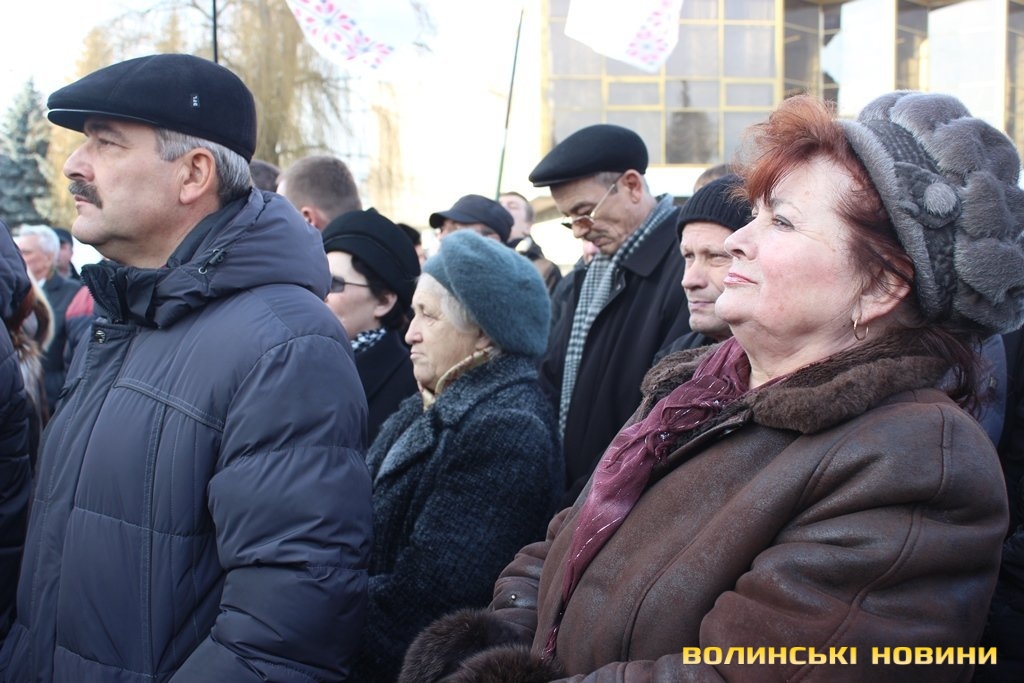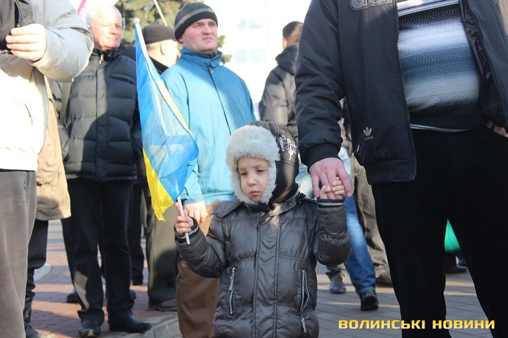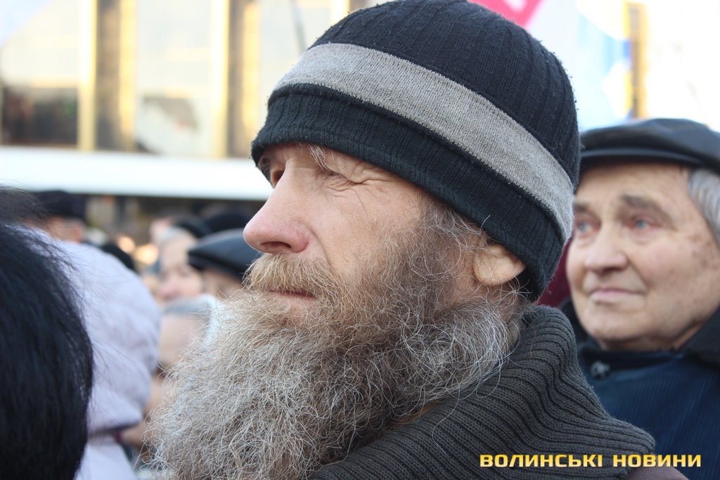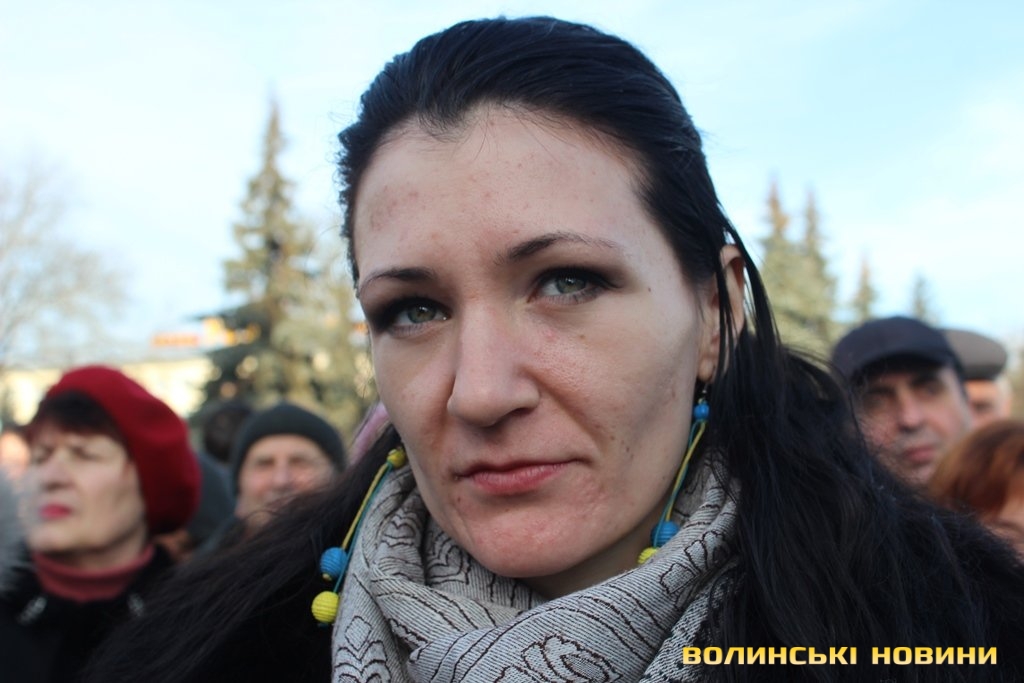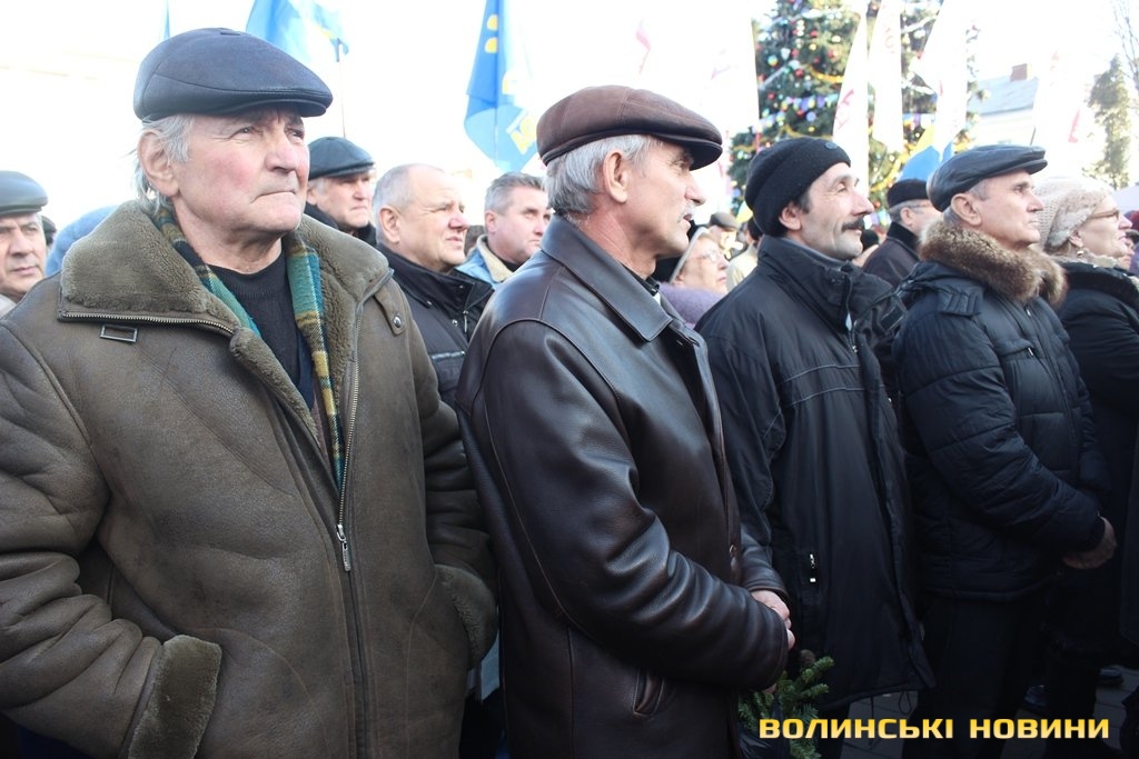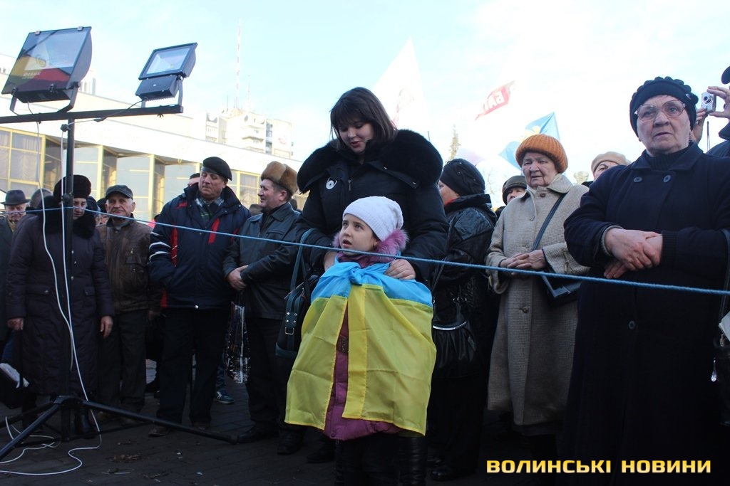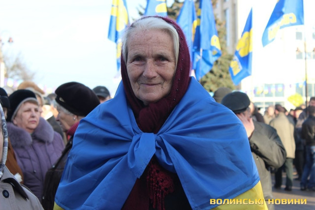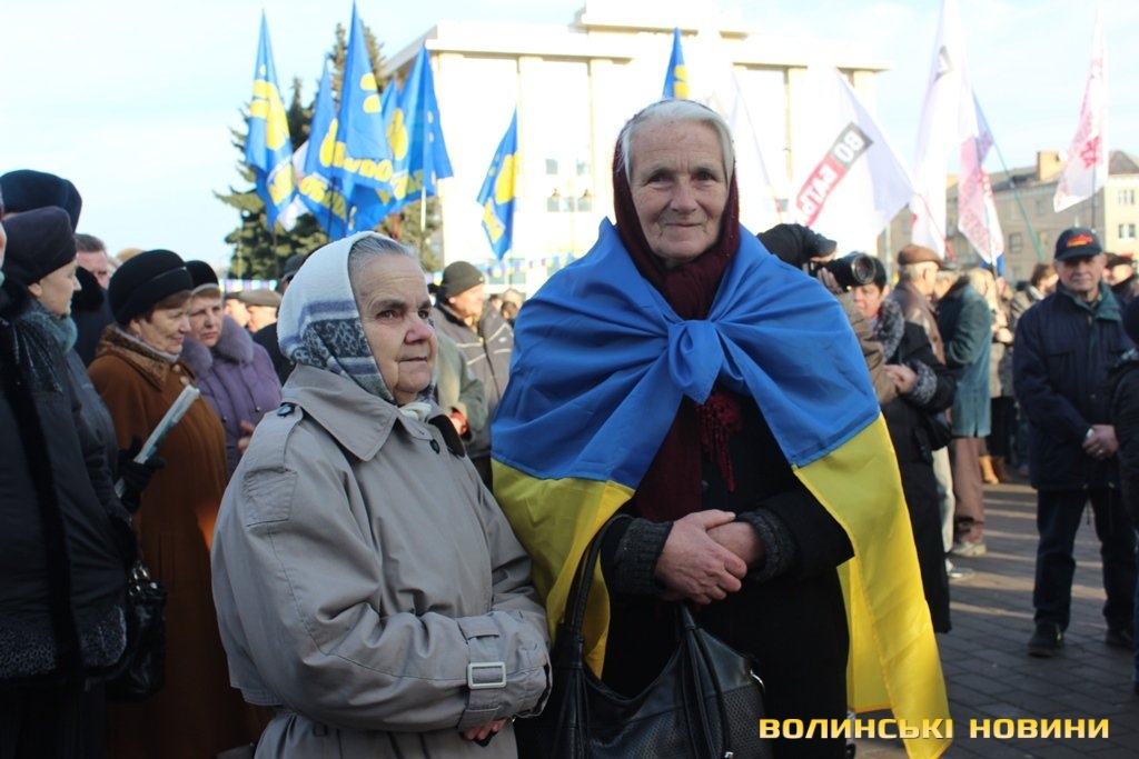 Серед людей, які прийшли на народне віче, більшість були старшого віку, прийшли і сім’ями з маленькими дітьми. Відстояти майбутнє України приїхала 67 літня пані Ніна з селища міського типу Цумань Ківерцівського району.Вона каже, шо приїхала в обласний центр, на народне віче, бо здоров’я не дозволяє їхати у столицю. А тут, каже, щоб підтримати молодь і вигнати бандитів. Бідкається, що пропрацювала в медицині 39 років, а пенсія нижча середньої. Та наголосила пані Ніна, що ми – європейці, живемо в центрі Європи, тому і рівень життя повинен бути європейський.
