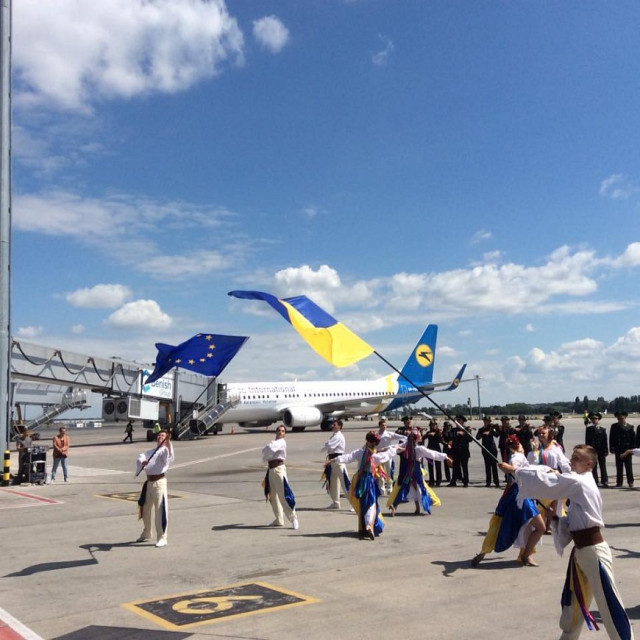 Розважальна програма в аеропорту почалася о 10:30 з вильоту перших акційних безвізових рейсів в Брюссель та Вільнюс – виступав Національний академічний ансамбль танцю ім. Павла Вірського. Пасажирів рейсу в Литву пригощали спеціальними кексами.