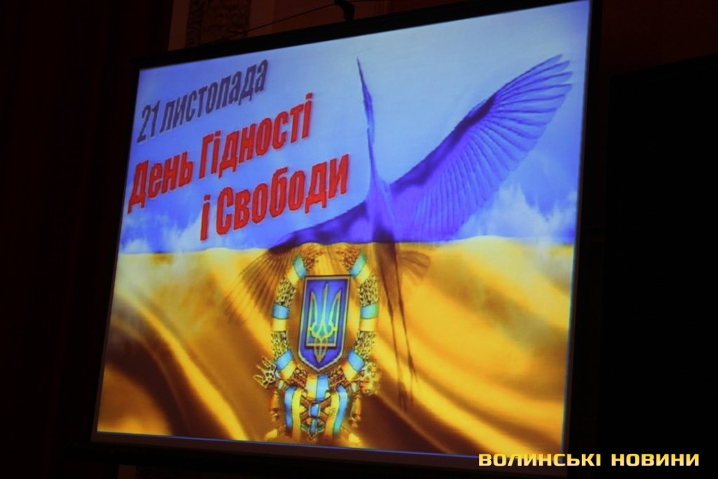 З нагоди відзначення Дня Гідності та Свободи у луцькому Палаці культури сьогодні, 21 листопада, відбулися тематичні заходи під назвою «Нас не поставлять на коліна, бо дух свободи й гідності не згас...».