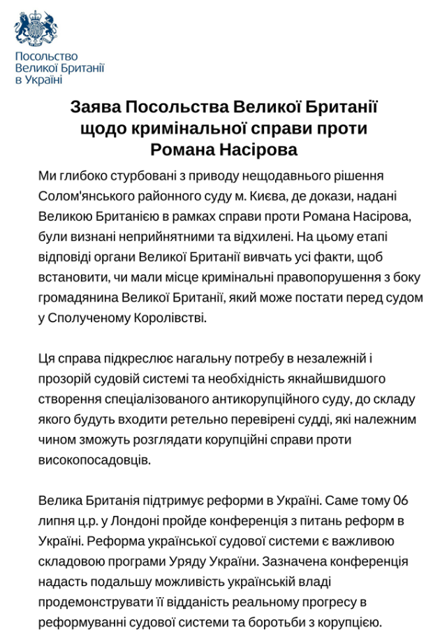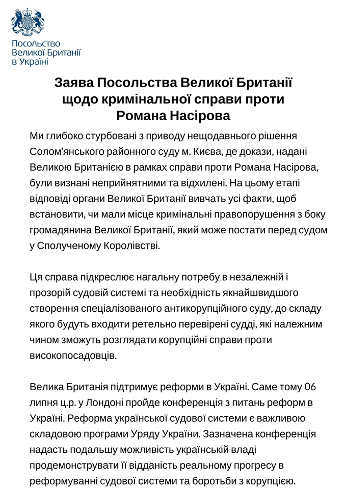 «Ми глибоко стурбовані з приводу нещодавнього рішення Солом'янського районного суду м. Києва, де докази, надані Великою Британією в рамках справи проти Романа Насірова, були визнані неприйнятними та відхилені. На цьому етапі відповідні органи Великої Британії вивчать усі факти, щоб встановити, чи мали місце кримінальні правопорушення з боку громадянина Великої Британії, який може постати перед судом у Сполученому Королівстві», - сказано в листі.