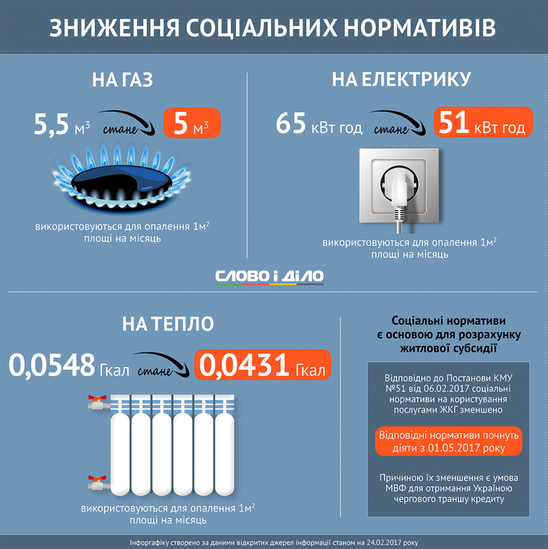 Відповідно до умов Міжнародного валютного фонду на надання чергового кредиту в рамках програми розширеного фінансування, Кабінет Міністрів України знижує соціальні нормативи тепло-, газо- і електропостачання з 1 травня 2017 року.