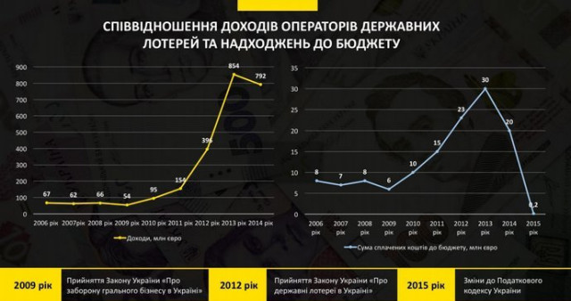 В Україні важко не помітити бурхливого розвитку лотерейної галузі. Фасади будівель у великих і малих містах прикрашені численними закликами «грати тут». Проте з лотереями українські заклади мають мало спільного. За яскравими вивісками ховаються мережі гральних автоматів, букмекерські контори та казино.