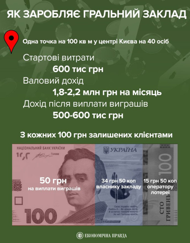 Ця точка генеруватиме 1,8-2,2 млн грн на місяць. Валовий ігровий дохід після виплати виграшів сягне 500-600 тис. грн. Із 100 грн, залишених клієнтами, 50 грн буде йти на виплати виграшів, інші 50 грн ділитимуться так: оператору лотерей – 31%, власнику – 69%. Операційні витрати покриває власник.