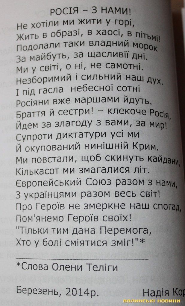 Бажання жити в мирі й не допустити війни в Україні представники нацменшин висловили в піснях і віршах, які звучали українською, російською, азербайджанською, вірменською, єврейською, польською, чеською мовами.Присутні на заході представили й власні творчі доробки. Зокрема, Надія Корнійчук написала 60 віршів, зокрема, про загиблих на Євромайдані та про мир в країні.
