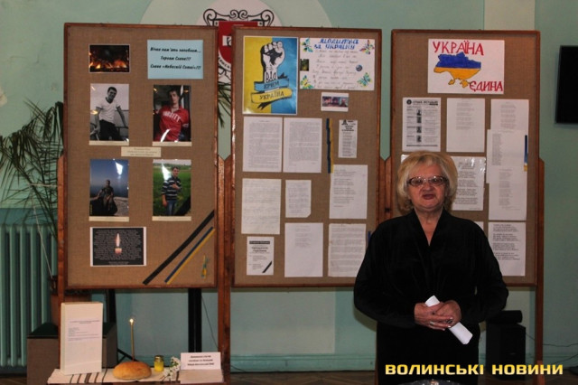 «На жаль, у мирний час нам довелося ставити пам’ятний знак жертвам катастрофи на ЧАЕС на нашому меморіалі Слави, тепер там буде ще й пам’ятник загиблому воїну «Небесної Сотні». Чому у матерів не висихають сльози?!», - виступила працівник музею Лариса Гриб.