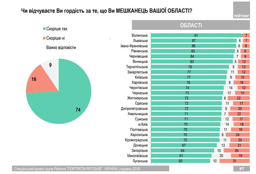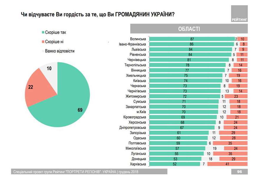 Відповідно до дослідження групи "Рейтинг", 87% волинян пишаються тим, що вони українці.