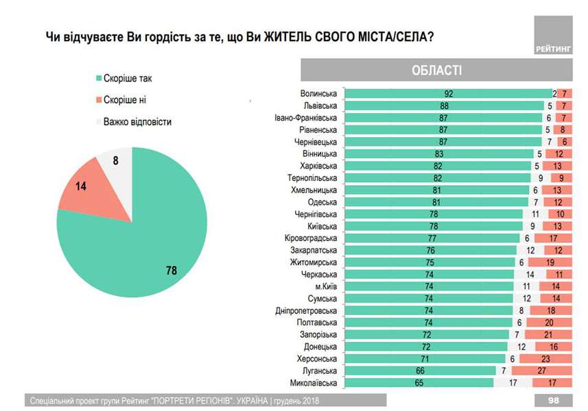 91% волинян гордяться тим, що вони народилися і проживають на Волині, а 92% – тим, що живуть у своєму місті чи селищі.