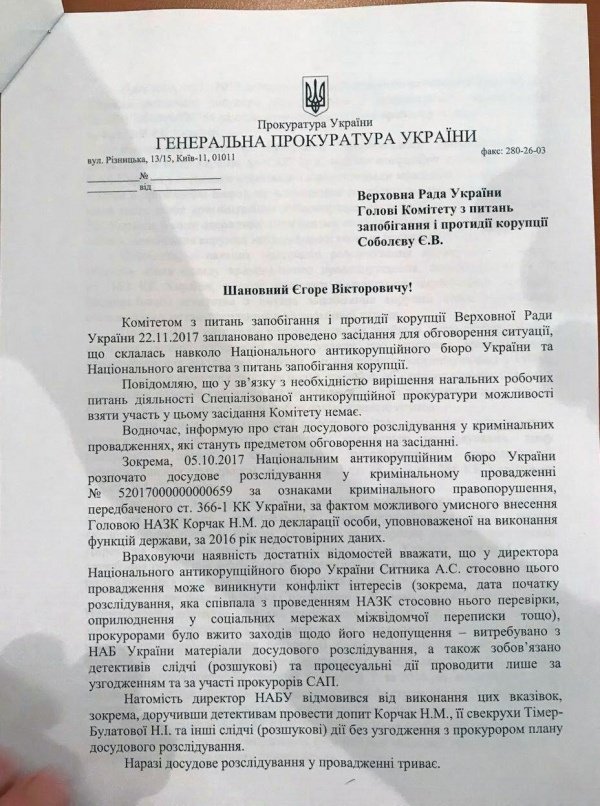 Видання також опублікувало лист Холодницького до антикорупційного комітету Верховної Ради з поясненням, чому він 22 листопада не може прийти на засідання відомства.