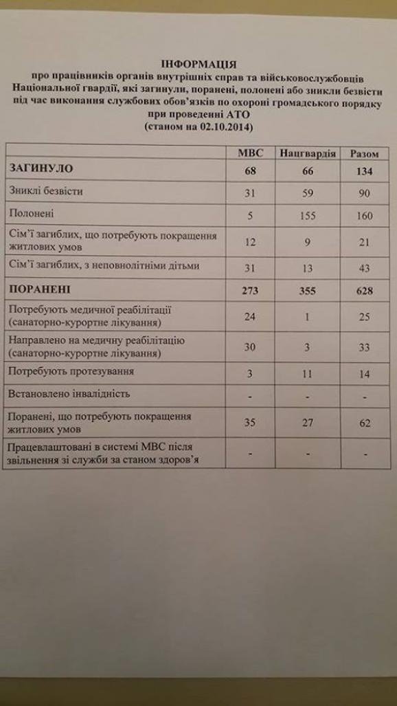 134 працівники МВС та службовці Нацгвардії загинули в зоні АТО за станом на 2 жовтня. Ще 90 вважаються зниклими безвісти.