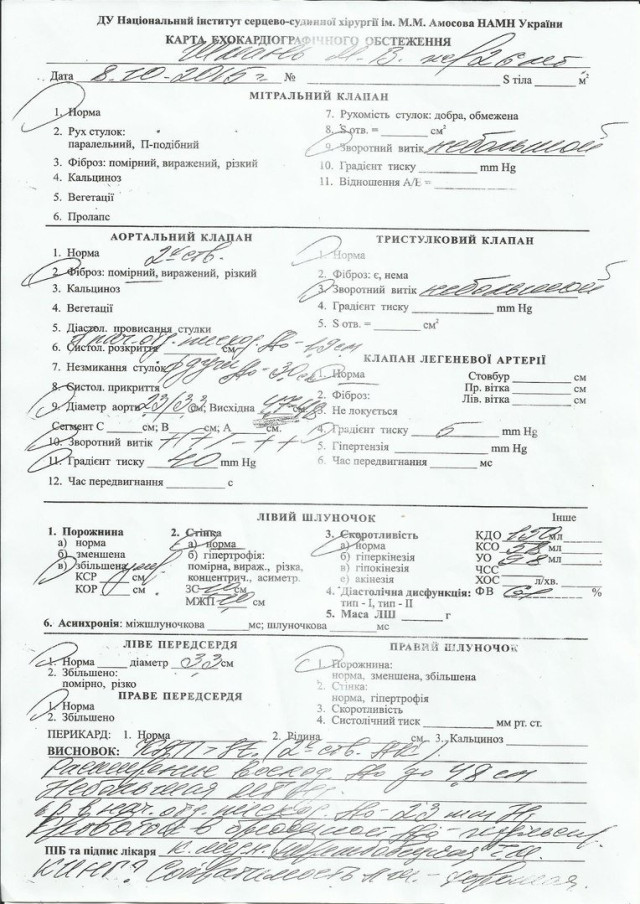Діагноз: Двостулковий аортальний клапан. Комбінована аортальна вада без переважання. Аневризма висхідної аорти (4,8-4,9 см.).