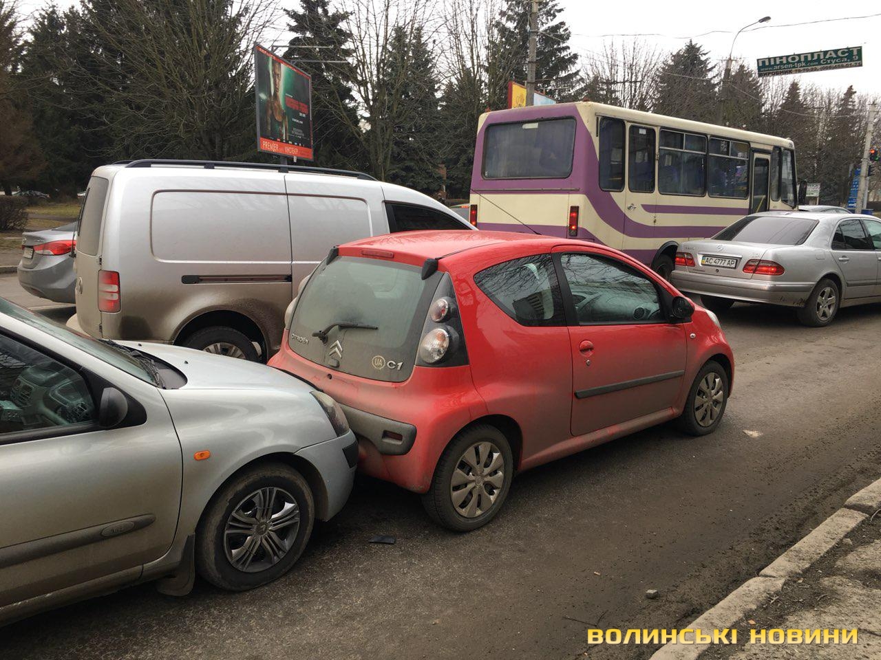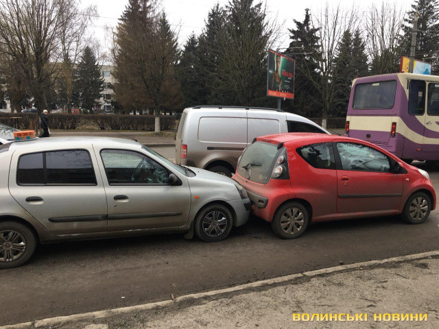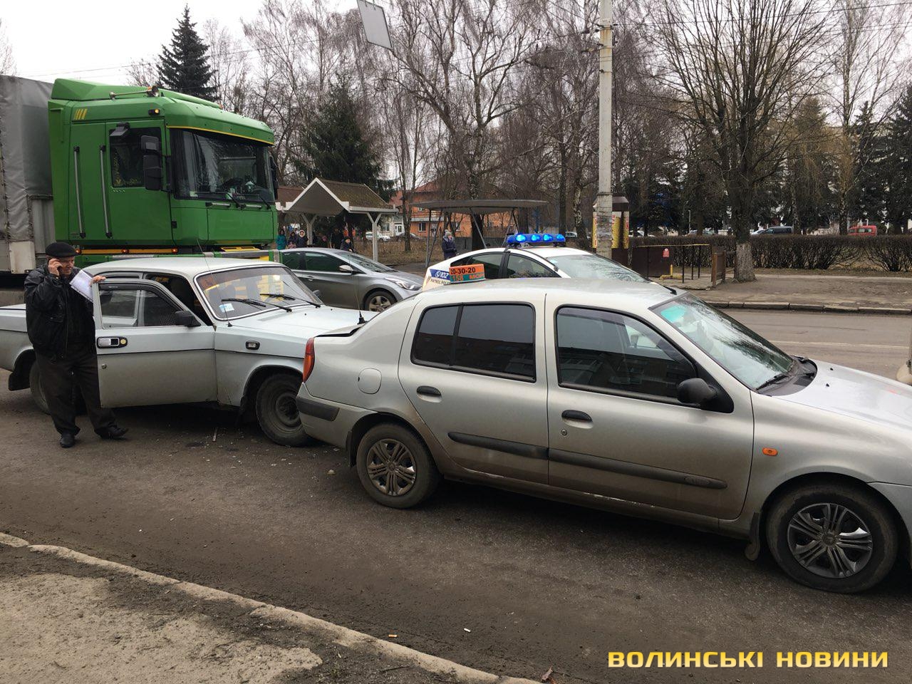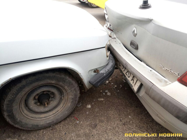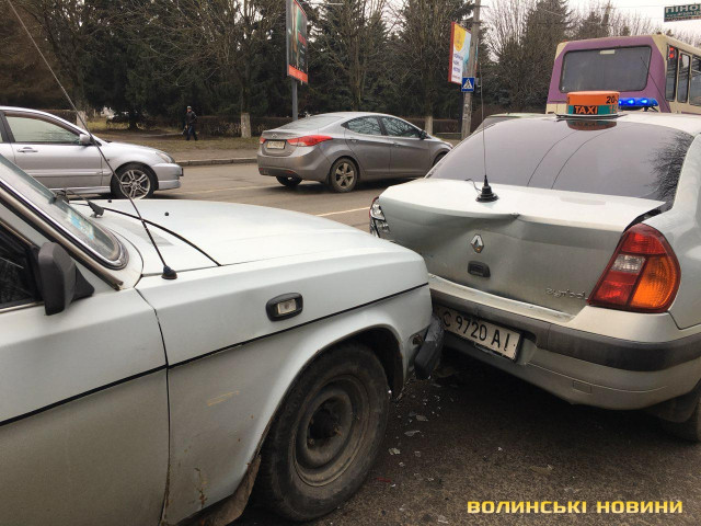 Як розповів водій таксі Інформаційному агентству Волинські Новини, його авто стояло на світлофорі, коли у нього в’їхала «Волга», тож його «Рено» штовхнуло вперед і воно зіткнулося з «Сітроеном».