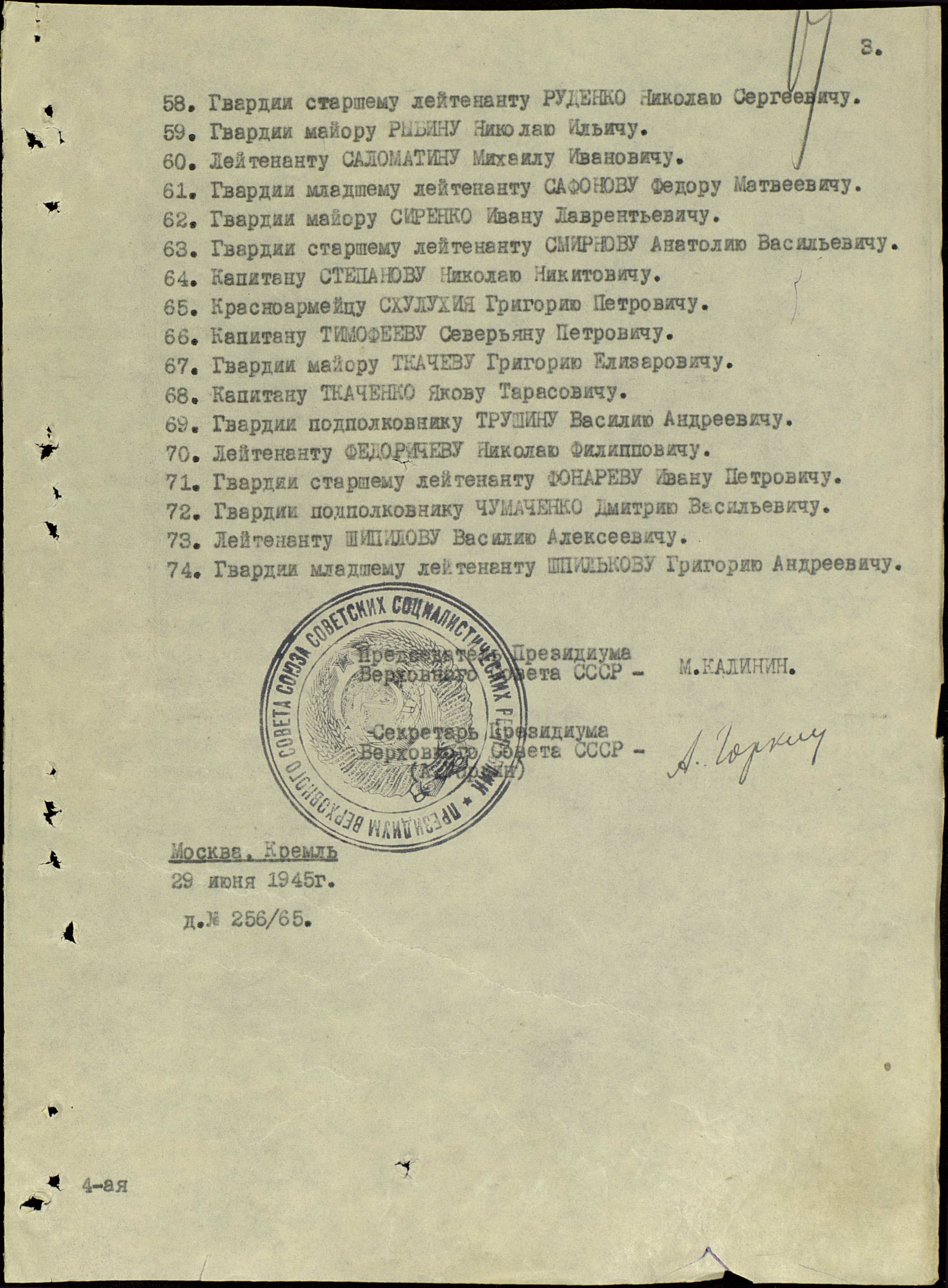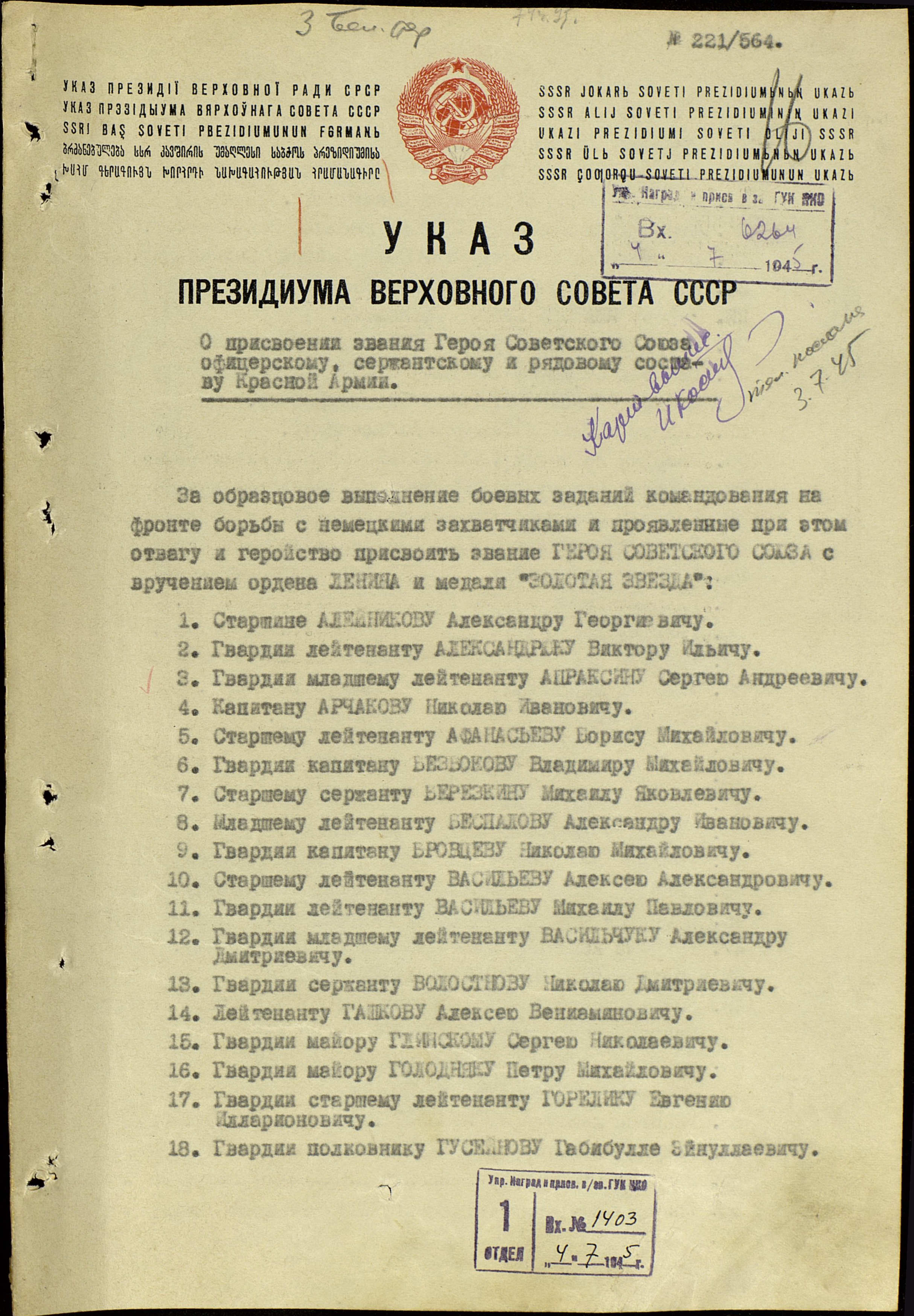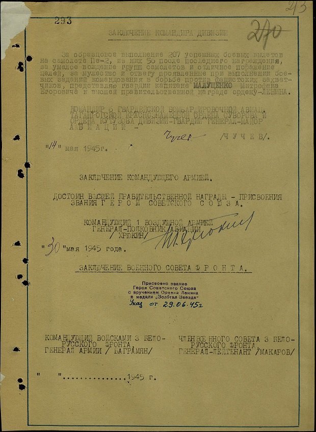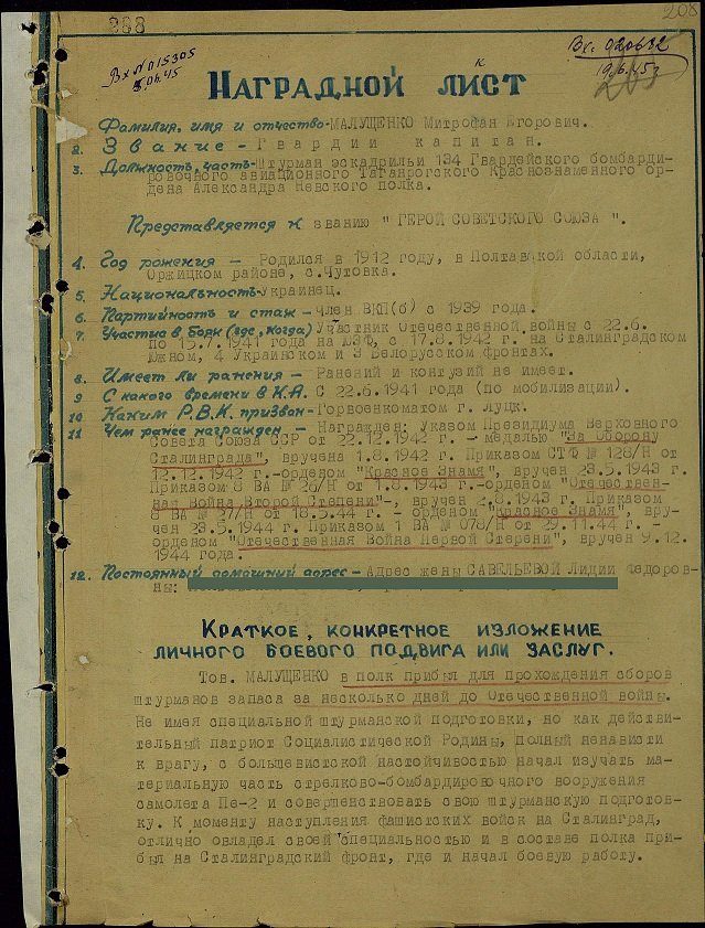 За зразкове виконання завдань командування і проявлені при цьому мужність і героїзм Указом Президіума Верховної Ради СРСР від 29-го червня 1945 гвардії капітана Малущенка Митрофана Єгоровича нагородили найвищою державною нагородою – званням Героя Радянського Союзу із врученням ордена Леніна і медалі «Золота Зірка» (медаль № 6350). Нижче подані унікальні скани нагородних документів з Центрального Архіву Міністерства Оборони в місті Подольськ Московської області, в яких вказано про присвоєння гвардії капітану Малущенку звання Героя Радянського Союзу, а також унікальні скани автографу його автобіографії та довідки про роботу і службу, в яких вказано про його роботу в Луцькому педагогічному інституті.
