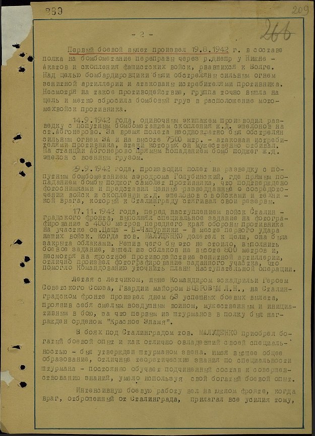 «В сентябрьское утро 1942 года экипаж Пе-2 в составе летчика Леонида Боброва, штурмана Митрофана Малущенко и стрелка-радиста Василия Ратникова получил боевое задание разведать вражеский аэродром Тузов. В то время под Сталинградом действовала известная вражеская эскадра «Удет». Ее асы оказывали нашим разведчикам сильное противодействие. Знал эту неприятную истину и экипаж Боброва. После пролета линии фронта Бобров и Малущенко увидели по пыльному следу на находящемся в 25 километрах впереди их аэродроме Тузов взлетающую пару немецких истребителей. Сбросив по стоянке аэродрома бомбы, сфотографировав его и сосчитав самолеты, экипаж после разворота лег на обратный путь, но тут же был атакован уже набравшей высоту парой «мессершмиттов». Самообладание и выдержка, умноженные на хитрость и мастерство, сыграли в этом воздушном бою решающую роль. Тот, кто так же, как и парашютисты, в критическую минуту не падает духом, а ищет выход из, казалось бы, самого, что ни на есть безвыходного положения, обязательно победит! Ведущий пары «мессеров», выполнив поспешную атаку и определив, что у штурмана Пе-2 отказал пулемет, решил поиграть с нашим самолетом, как играет кот с пойманной мышкой. Он установил «мессер» рядом с Пе-2 и открыл фонарь кабины. Наши ребята увидели на фюзеляже «мессера» всяческие разрисовки. Здесь была даже и змеевидная спираль, которая, вероятно, по замыслу фашистов должна ввинчиваться в предстоящую жертву, как ввинчивается штопор в пробку ромовой бутылки. Малущенко тем временем быстро разбирал пулемет, ругая механика по вооружению за то, что тот «набухал» так много смазки. А Бобров, оценив обстановку, сказал скороговоркой: - Ух, сволочь фашистская! Сейчас мы тебе покажем... Ратников! - Слушаю, командир! - У тебя «ШКАС» в каком окне установлен? - В правом, командир! - Поставь его в левое окно! - Сейчас... - Командир, «мессеры» справа! - раздался тревожный голос Малущенко. - Вижу! Ратников, поставь, говорю тебе, «ШКАС» в левое окно. Я разверну машину вправо вниз, под ведущего «мессера», а ты дашь по нему очередь из «ШКАСа». Подлиннее только дай очередь. - Понял, командир! - Обожди, обожди... Отставить «ШКАС»! Не достанешь с него... Будешь бить по ведущему из «Березина». Сделаю разворот назад с очень большим креном. Бей без промаха! Понял меня? - Понял! - Только бей без промаха! - Постараюсь, командир. - Задержка устранена! - доложил в это время Малущенко. - Хорошо! - сказал Бобров. - Смотри теперь за ведомым. И он с креном девяносто градусов бросил машину вправо вниз, под ведущего «мессера». «Брюхо» немецкого истребителя оказалось у Ратникова как на ладони. Длинная очередь из «Березина», и истребитель, перевернувшись через крыло и сильно задымив, пошел штопором к земле. Ведомый «мессер», увидев все это, взмыл, как ужаленный, влево вверх и подался восвояси. Так на одиночном бомбардировщике Пе-2, уступающем паре «мессершмиттов» в маневренности и вооружении, экипаж Боброва одержал победу. Причем одержал ее над вражеским аэродромом. Этот замечательный экипаж выполнил вместе за войну 216 боевых вылетов. Леонид Бобров и Митрофан Малущенко стали Героями Советского Союза, а Василий Ратников награжден двумя орденами Славы».
