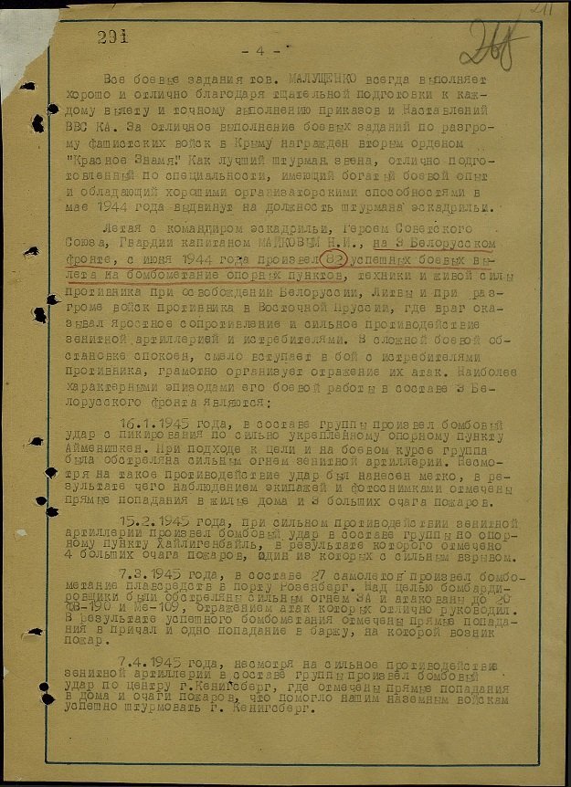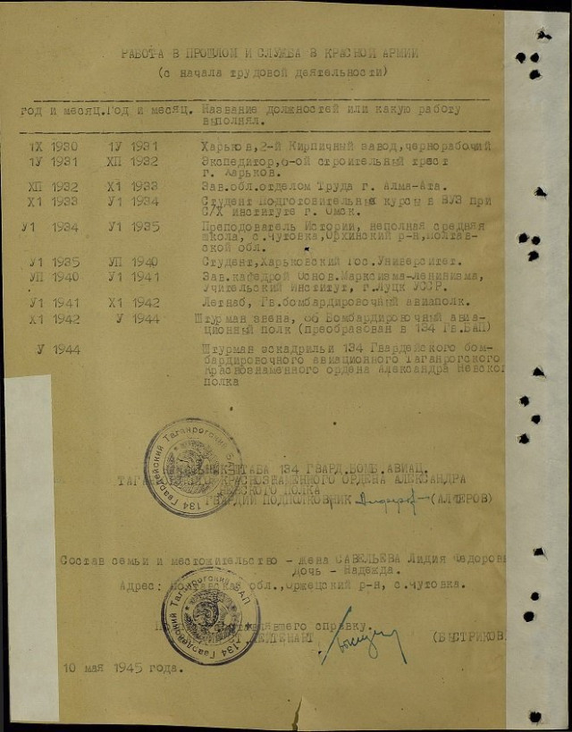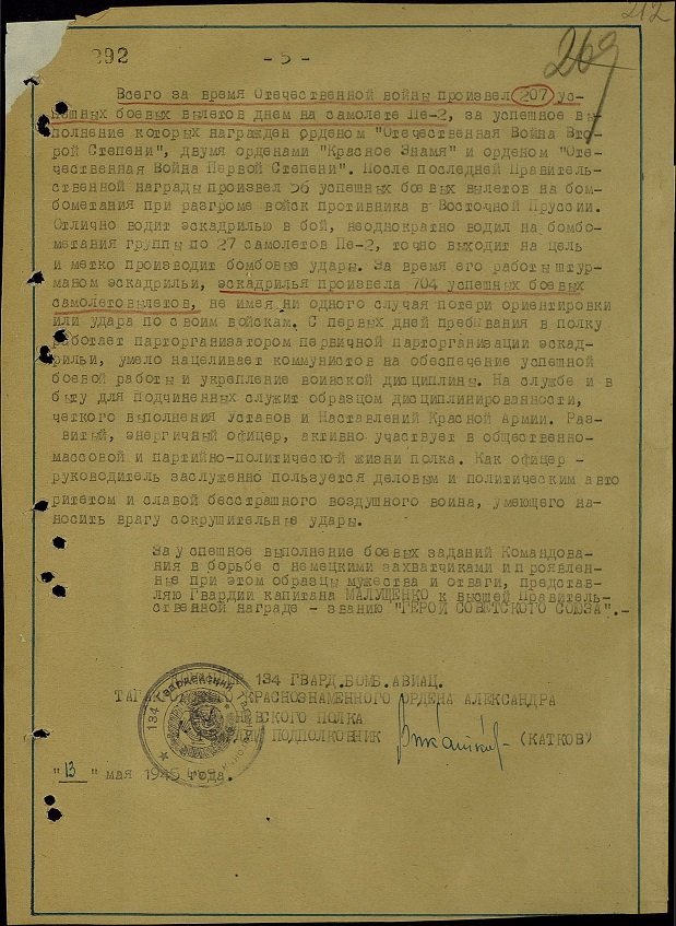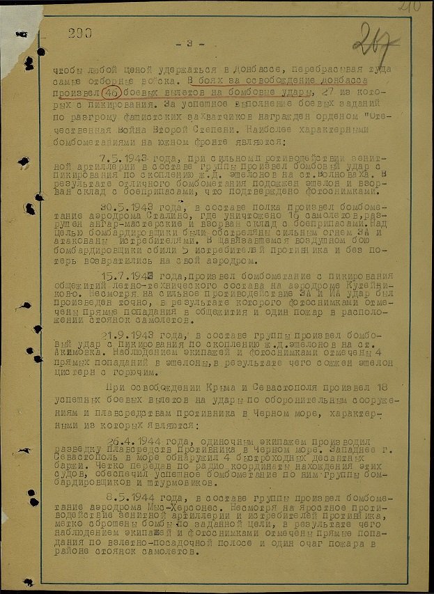 «В боях за звільнення Донбасу (Південний Фронт) здійснив 46 бойових вильотів на бомбардування, 27 з яких були здійснені методом пікірування (літав на пікіруючому бомбардувальнику Пе-2). Особливо відзначився: 7 травня 1943 року при бомбардуванні скупчення німецьких ешелонів на станції Волноваха (підпалено ешелон і знищено склад з боєприпасами); 30 травня 1943 року при бомбардуванні аеродрому в районі Сталіно (нині Донецьк – авт.) було знищено 16 ворожих літаків, розбитий ангар-майстерня, підірваний склад з боєприпасами, у повітряному бою ланкою бомбардувальників було збито в повітрі 5 винищувачів противника; 15 липня 1943 року внаслідок нальоту на аеродром противника в районі Кутейниково було знищено льотну казарму та підпалено стоянку літаків; 21 вересня 1943 року у складі групи здійснив бомбардування станції Акимівка, на якій було знищено ешелон з пальним. Знову відзначився при звільнені Криму і Севастополя. Здійснив 18 успішних бойових вильотів, у результаті яких були знищені або пошкоджені 4 десантні баржі (26-го квітня 1944 року), успішно атакований німецький аеродром в районі миса Херсонес (8-го травня 1944 року)».