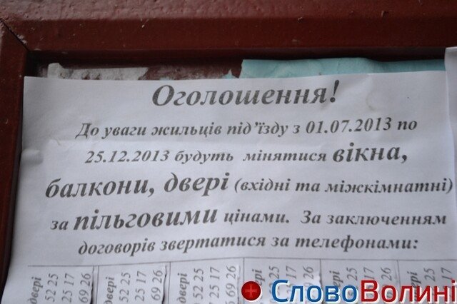 Крім калькування і незнання пунктуації, лучанам щодня демонструють оригінальні варіанти відмінювання слів. Поштове відділення пропонує послугу «приймання плати», а в оголошенні ЖЕКу «вікна, двері та балкони будуть мінятися за пільговими цінами». Отак візьмуть – і швидко поміняються місцями: де був вхід – стане вікно, де балкон – вихід буде. Чи щось не так написали?