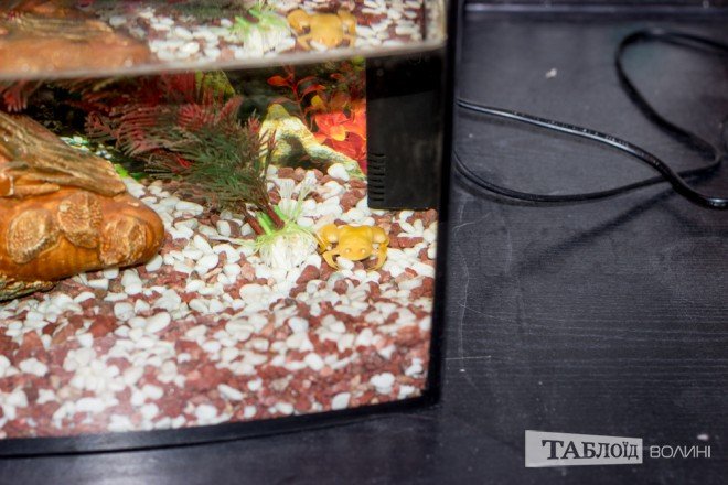 Жабку Луцькому зоопарку подарували, а разом із нею ‒ багато клопотів. Виявилось, що жити вона може лише у персональному акваріумі, який довелось купити разом з водоростями, камінцями, очищувачем води й компресором. Жабка маленька й жовта. Ввечері тваринка влаштовує у кабінеті цілі гастролі ‒ завзято квакає й кумкає. Ще однією особливістю жаби є те, що вона вміє їсти руками.