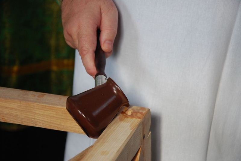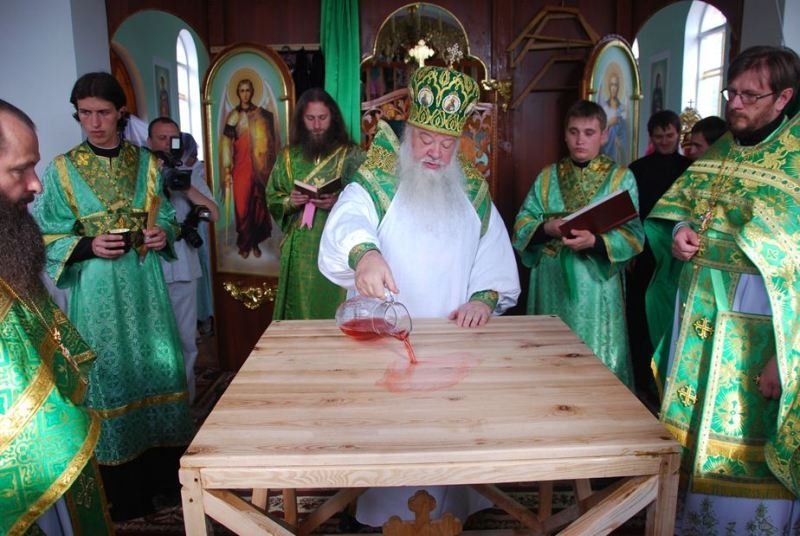 освяченя престолу здійснюється таким чином. Перш за все архієрей, благословивши співслужителів по службі, окроплює святою водою стовпи престолу і кути його поливає хрестоподібно киплячим воськомастіхом, а священики подихом вуст охолоджують воськомастіх. Воськомастіх, інакше мастика (тобто склад з воску, мастики, товченого мармуру, росного ладану, алое і інших благовонних речовин), служивши разом з цвяхами засобом для прикріплення дошки престолу, в той же час знаменує ті аромати, якими помазав Никодим тіло Спасителя після зняття з Хреста -- це про каву, як ти недоумку виразився!!!!!!