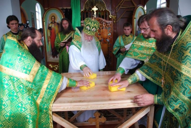 Обмивання і помазання престолу святим Миром престол омивається двократно: вперше теплою водою з милом, а удруге — рожевою водою, змішаною з червоним вином. Тому і іншому обмиванню передує таємна молитва архієрея над водою і вином про послання на них благословення Іорданова і благодать Святого Духу до освячення і здійснення жертовника. При обмиванні престолу водою співається 83-й псалом, а після обмивання престол обтирається рушниками.Вторинне обмивання престолу полягає в триразовому хрестоподібному возліванії на нього червоного вина, змішаного з рожевою водою (родостамною). При кожному возліванії змішення архієрей говорить слова 50-го псалму: «Окропіши мя іссопом і очищуся: омиєши мя і паче сніги убелюся», а після третього возліванія читаються останні вірші до кінця псалму. Священики розтирають родостамну, втираючи її руками у верхню дошку престолу, потім кожен священик губою витирає «трапезу».