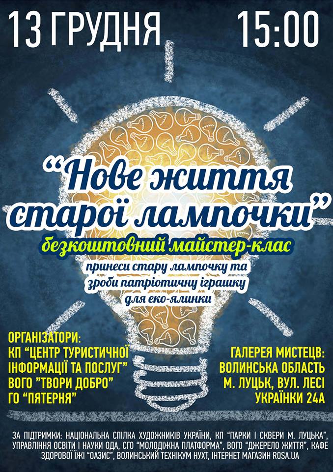 В рамках акції «Подаруй друге життя старій лампочці!» у Луцьку для всіх охочих відбудеться майстер-клас «Нове життя старої лампочки» із розпису старих лампочок, де буде здійснено чарівне перетворення їх в чудові новорічні іграшки.