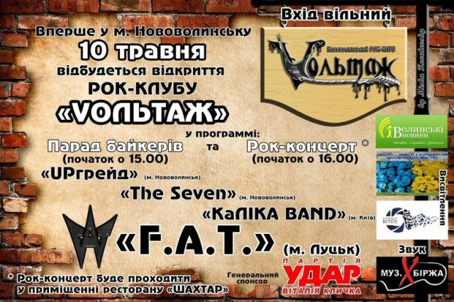 «Волинські новини», своєю чергою, нагадують, що відкриття рок-клубу 10-ого травня у Нововолинську розпочнеться із грандіозного параду байкерів о 15:00. Також за годину стартуватиме концерт у ресторані «Шахтар» (бульвар Шевченка, 24). Під час концерту гратимуть місцеві гурти «UPгрейд» і «The Seven», кияни «КаЛІКА BAND» та інші, а хедлайнером дійства стане луцький гурт «F.A.T.». Вхід на рок-концерт вільний.