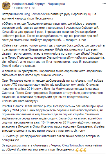 «Війна вже йде чотири роки, і це, з одного боку, добре, що в цьому році в іграх взяли участь більше поранених бійців ніж в минулому, і вони цікавляться спортом, і мають можливість потрапити в збірну України, але Петро Порошенко повинен був закінчити війну набагато швидше (як він і обіцяв), а не «затягувати» її на чотири роки. Тоді б і поранених було б набагато менше», - наголосив ветеран «Азова».