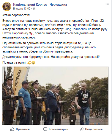 До речі, після того, як «азовець» демонстративно не помітив президента, навіть коли той поплескав його по плечу, сторінку «Нацкорпусу» в соцмережі почали активно атакувати «порохоботи». Коментатори закидали гнівними репліками вчинок бійця. Повідомлення негативного змісту посипались практично одночасно. Послання були однотипними і виглядали, як спроба дискредитації Толмачова з метою зберегти обличчя президента.