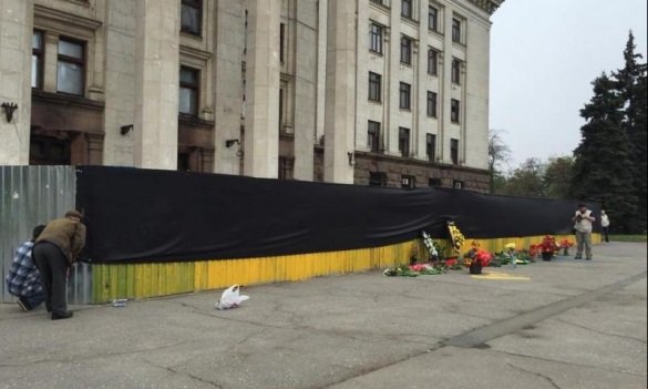 Паркан біля Будинку профспілок в Одесі задрапували чорною тканиною, повідомляєТраса Е-95.