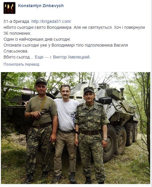 «Нібито сьогодні свято Володимира. Але не святкується. Хоч і повернули 36 полонених. Один із найчорніших днів сьогодні. Опізнали сьогодні уже у Володимирі тіло підполковника Василя Спасьонова. Вбито сьогодні два наших снайпери, яким ми берці відправили... Дуже дурна смерть. Не маю настрою подробиці писати. І не можу стримати сліз, коли дізнався про смерть Віті Хмелецького, начальника зв'язку 51-ї бригади. Поранених багато», - пише активіст.