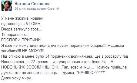 Волонтер Наталія Соколова на своїй сторінці у Фейсбуці повідомила про те, що поранено 18 хлопців з 51-ої бригади: